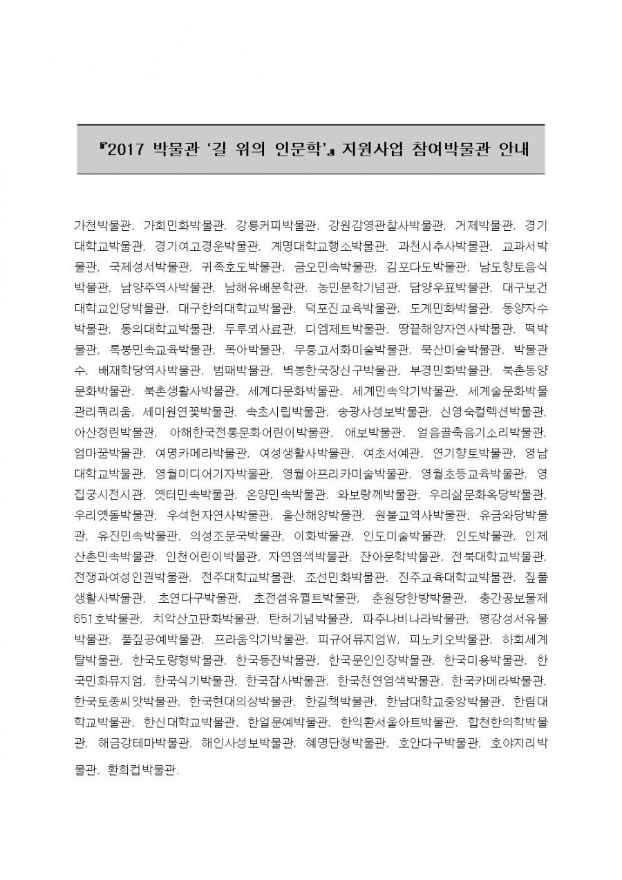 2017 박물관 길 위의 인문학 지원사업 참여박물관 페이지 정보 작성자 관리자 작성일17-03-07 09:18 조회42,159회 댓글0건 관련링크 이전글 다음글 목록 본문 2017 박물관 길 위의 인문학 지원사업 참여박물관 댓글목록 등록된 댓글이 없습니다. 이전글 다음글 목록