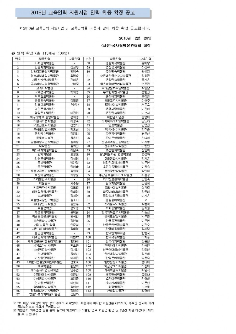 2016년 교육인력 지원사업 인력 최종 확정 공고 페이지 정보 작성자 관리자 작성일16-02-26 19:54 조회43,015회 댓글0건 관련링크 이전글 다음글 목록 본문 댓글목록 등록된 댓글이 없습니다. 이전글 다음글 목록