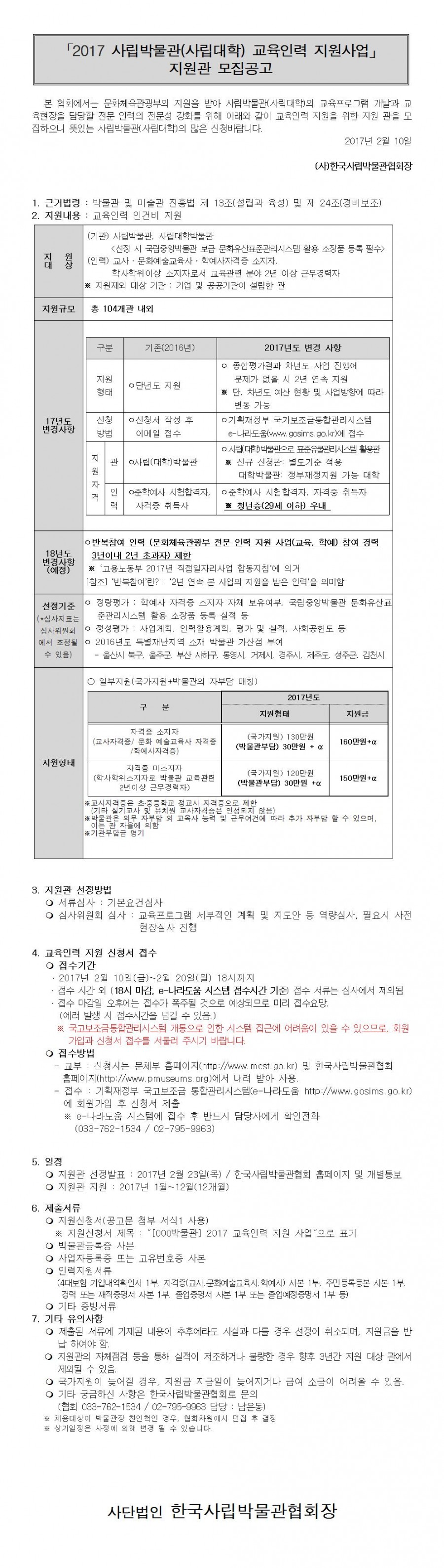 2017 사립박물관(사립대학) 교육인력 지원사업 지원관 모집 공고
