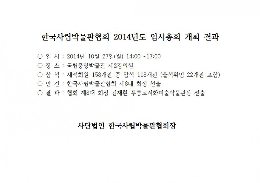 한국사립박물관협회 2014년도 임시총회 개최 결과 페이지 정보 작성자 관리자 작성일14-10-28 14:42 조회42,114회 댓글0건 관련링크 이전글 다음글 목록 본문 댓글목록 등록된 댓글이 없습니다. 이전글 다음글 목록