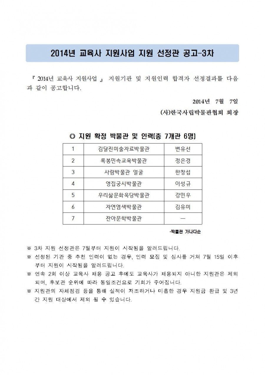 『 2014년 교육사 지원사업 』 지원기관 선정 공고 - 3차 페이지 정보 작성자 관리자 작성일14-07-07 14:29 조회40,183회 댓글0건 관련링크 이전글 다음글 목록 본문 댓글목록 등록된 댓글이 없습니다. 이전글 다음글 목록