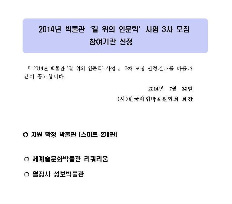 [인문학] 2014 박물관 길 위의 인문학 3차 기관모집 선정결과발표 페이지 정보 작성자 관리자 작성일14-07-30 14:31 조회39,369회 댓글0건 관련링크 이전글 다음글 목록 본문 댓글목록 등록된 댓글이 없습니다. 이전글 다음글 목록