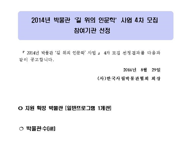 2014 박물관 길 위의 인문학 4차 기관모집 선정결과발표 페이지 정보 작성자 관리자 작성일14-08-29 14:33 조회40,160회 댓글0건 관련링크 이전글 다음글 목록 본문 댓글목록 등록된 댓글이 없습니다. 이전글 다음글 목록