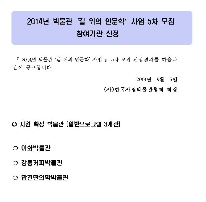 2014 박물관 길 위의 인문학 5차 기관모집 선정결과발표 페이지 정보 작성자 관리자 작성일14-09-05 14:34 조회40,460회 댓글0건 관련링크 이전글 다음글 목록 본문 댓글목록 등록된 댓글이 없습니다. 이전글 다음글 목록